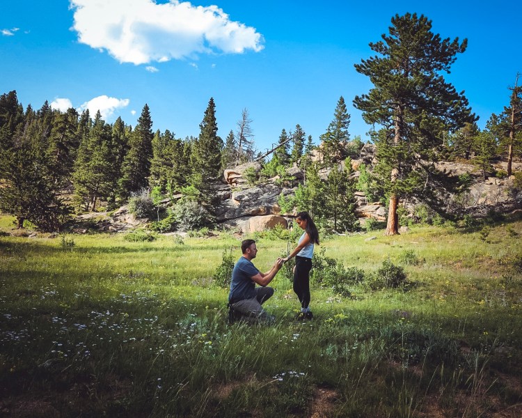 After camping in the Great Sand Dunes desert for a night, we decided to take it up a notch and hike into the the Rocky Mountains for some primitive camping. Rocky Mountain National Park’s Dream Lake was the destination point for Ryan’s proposal, but after gaining over a thousand feet in elevation, and traversing over multiple miles, switchbacking up the mountainside with loaded packs to our campsite, we ended up collapsing at our site, falling asleep, and then stumbling, somehwhat serendipitously, upon a beautiful meadow on the outskirts of our home-for-the-night. Ryan magically captured the moments on his remote from his camera to his phone. It was a surreal, unexpected, and special moment shared by just us…no one else for miles.